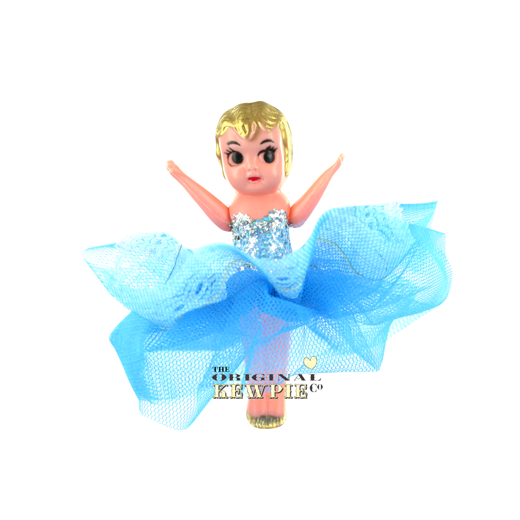 This is Alice, she is dressed in a one of a kind design by The Original Kewpie Co. Hand painted Silver Glitter Bodice with a sweetheart neckline, and a Periwinkle Blue Tulle Tutu skirt with Blue Lace trim. An Australian Original Kewpie Creation from 1983.