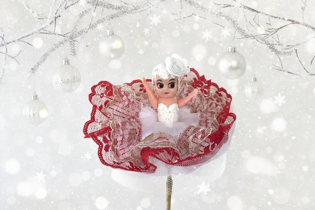Joy, the Christmas Kewpie Doll, is dressed in a one of a kind design by The Original Kewpie Co. White Glitter Bodice, White Tulle Tutu skirt with a fancy Christmas themed lace trim and a fabulous white rosette headdress. An Original Kewpie Creation from 1922.