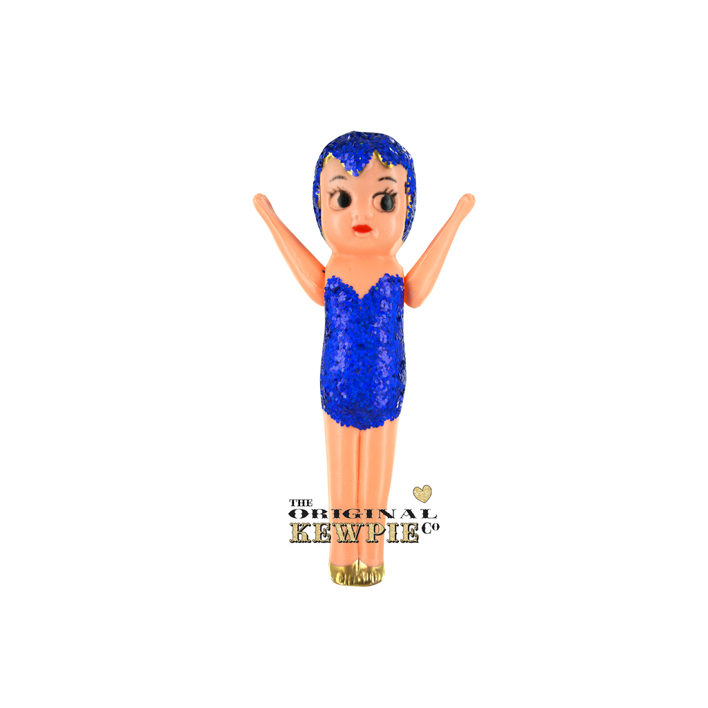 This Plain Kewpie comes with a hand painted full Glam Glittered head and sweetheart bodice in royal blue glitter.