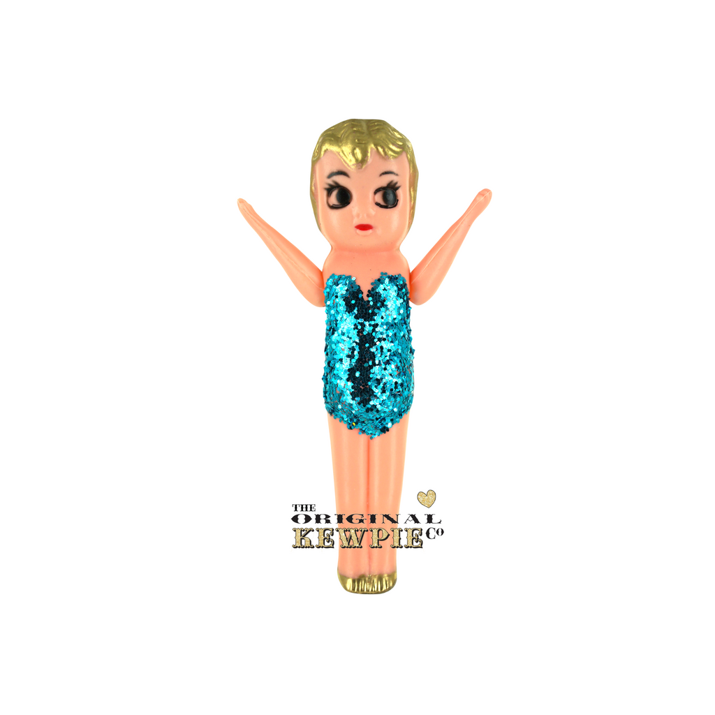 This Plain Kewpie comes with a hand painted sweetheart bodice in aqua blue glitter.
