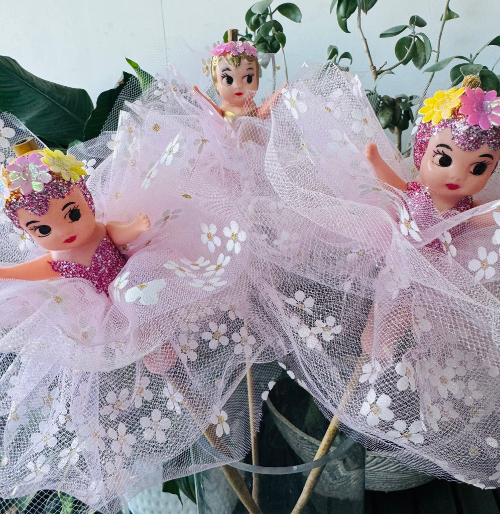 This is Daisy, she is dressed in a one of a kind design by The Original Kewpie Co. Hand painted white Glitter Bodice with a sweetheart neckline and light pink, daisy pattern Tulle Tutu skirt. An Australian Original Kewpie Creation from 1931.