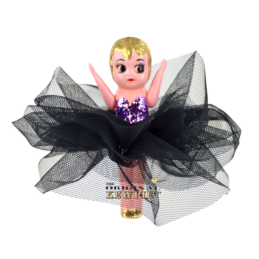 This dressed Original Kewpie Co Kewpie Doll comes with a lilac glittered bodice and an Original Kewpie Co Kewpie Doll black tulle tutu skirt.
