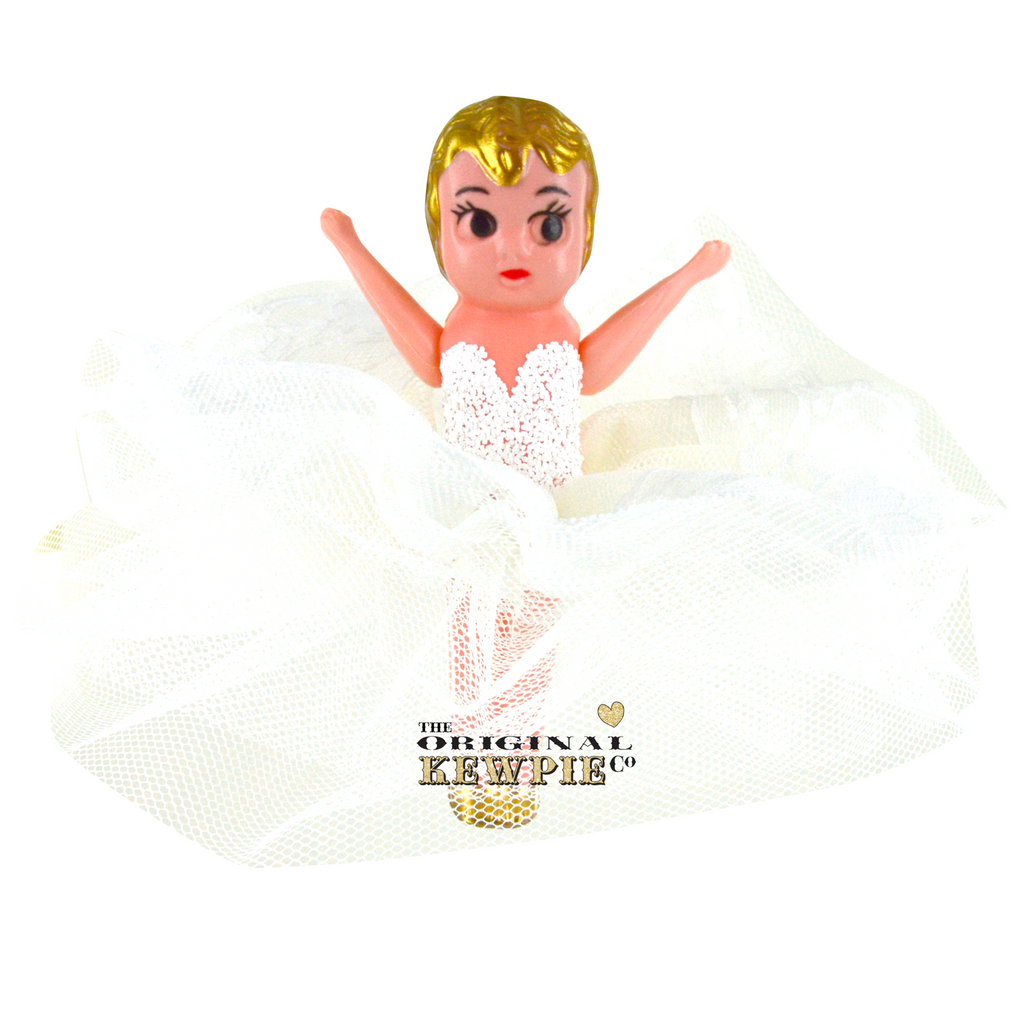 This dressed Original Kewpie Co Kewpie Doll comes with a White glittered bodice and an Original Kewpie Co Kewpie Doll White tulle tutu skirt with White lace trim.